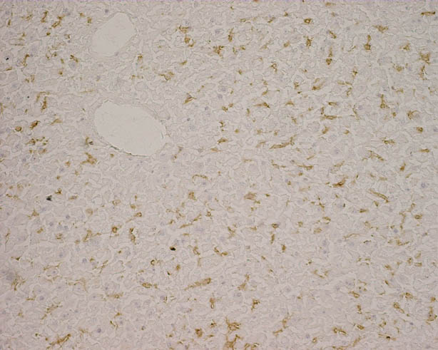 Click an image to enlarge. Sections of mouse liver, stained with monoclonal antibody F4/80