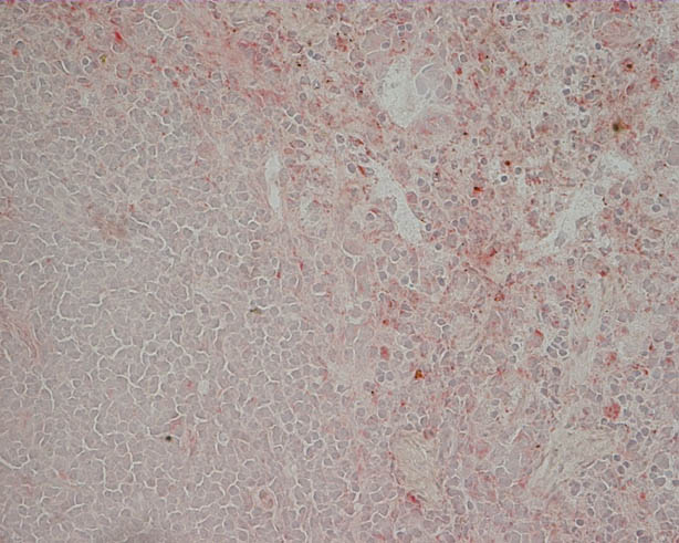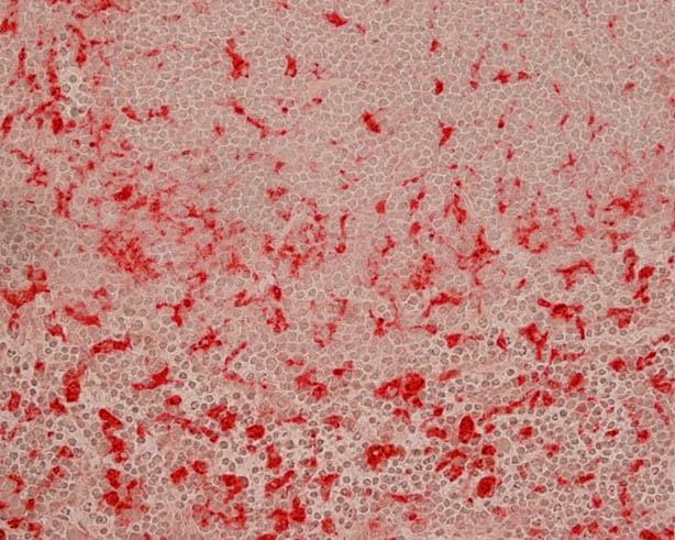 Bottom: Spleen of a mouse 2 days after injection with clodronate liposomes. Only few macrophages are left. |